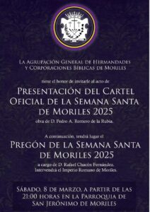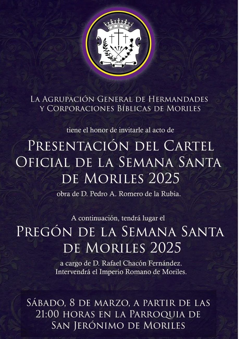El próximo sábado día 8 de marzo, se celebrará a partir de las 21:00 la presentación del Cartel Oficial de la Semana Santa de Moriles 2025, obra de D. Pedro A. Romero de la Rubia, y a continuación tendrá lugar el Pregón de la Semana Santa de Moriles 2025 a cargo de D. Rafael Chacón Fernández. Intervendrá el Imperio Romano de Moriles.